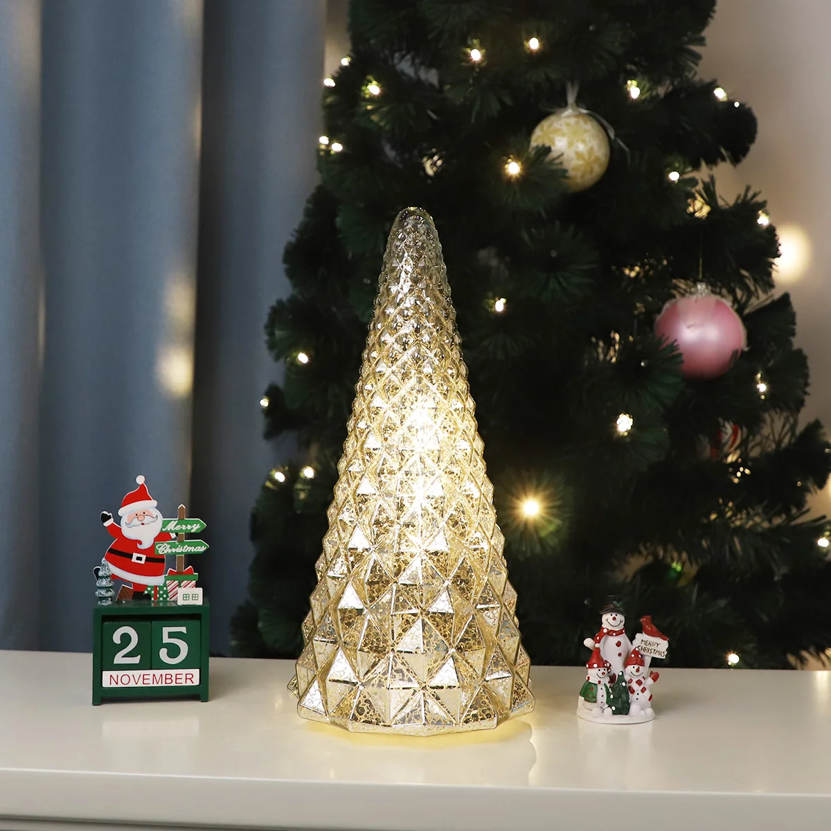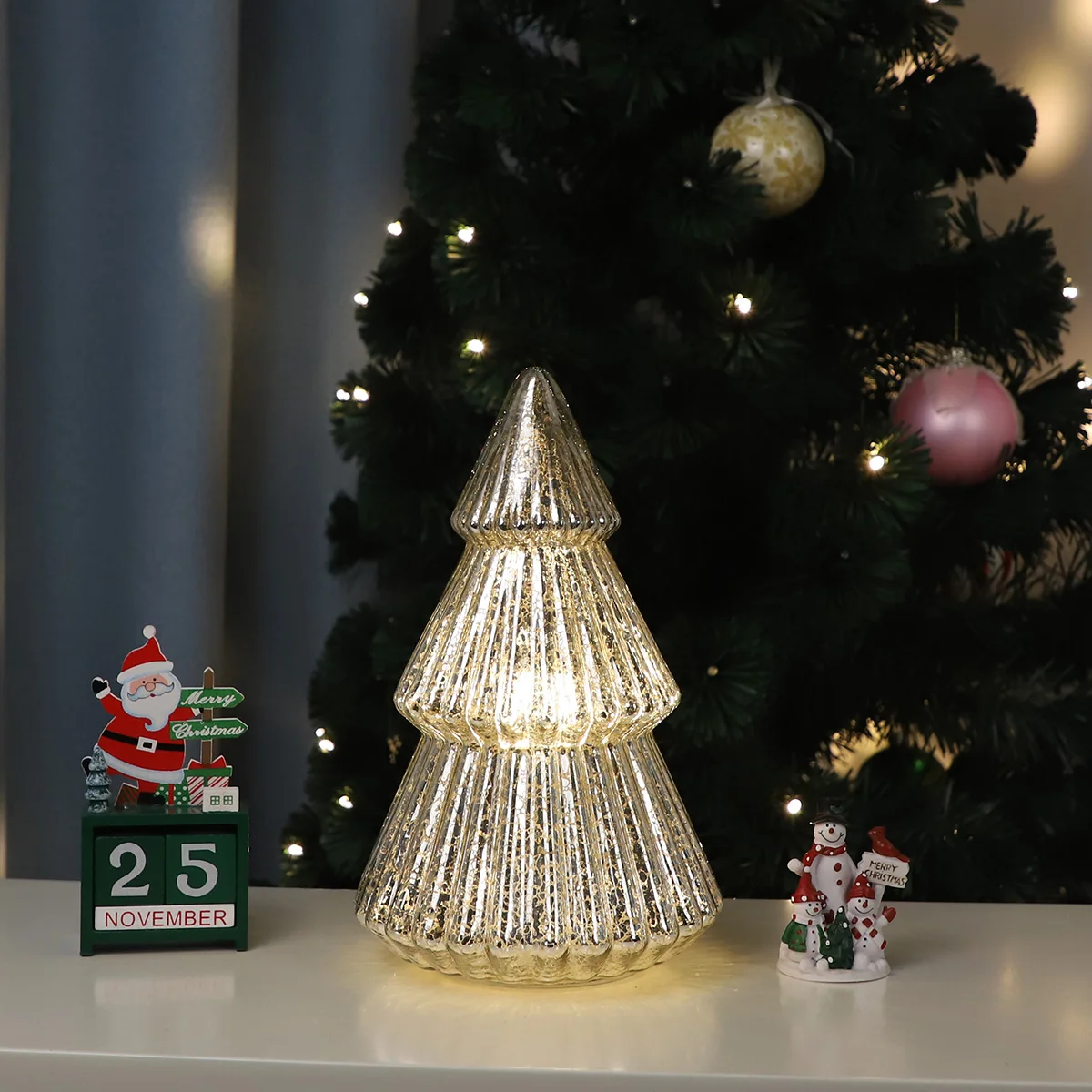 Ručně malované skleněné vánoční ozdoby, bílá vánoční led světla, umělý vánoční strom s teplým osvětlením